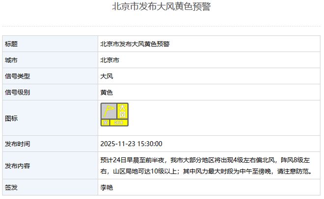 新京报讯 据北京市气象局消息,北京已发布大风黄色预警。预计24日上午至傍晚前半,北京大部分地区将出现4级左右偏北风,阵风8级左右,局部山区可能达到10级以上。最期待的时段是中午到晚上,要注意谨慎。编辑 李伊林子
