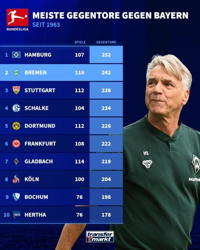9月26日现场广播。拜仁将在星期五晚上在家面对不来梅。德国转会市场网络计算了10支球队,他们的目标是拜仁以来,包括汉堡在内的拜仁和拜仁的进球最多,也是德甲联赛的第二名。自1963年德甲联赛开始以来,排名队以拜仁的目标最大的目标毕业:汉堡,107场比赛,252个进球在2。Bremen,116场比赛,242个同意的目的。
