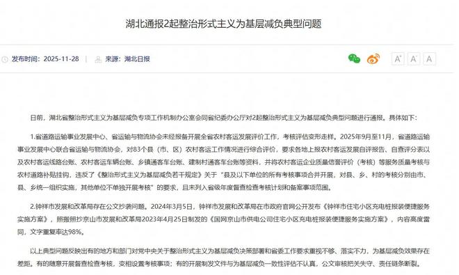 据湖北日报11月28日消息,日前,湖北省纠正形式主义、减轻群众负担专项工作机制办公室会同省纪委办公厅通报了纠正形式主义、减轻群众负担两个共性问题。图为网站通报截图,其中包括:钟祥市发展和改革局官方文件存在抄袭问题。 2024年3月5日,钟祥市发展和改革局在市政府官网向社会公开发布了《钟祥市住宅小区充电桩申请安装便民服务实施方案》。抄袭京师印发的《国网京山市供电公司住宅小区充电桩应用安装便民服务实施方案》2023年4月25日某市发展改革局发布的信息,内容极为相似,文字重复率达到98%。此外,湖北省道路运输发展中心和省交通物流协会正在开展全省客运发展发展无报告评估工作,评估工作于2025年9月至2025年11月,省道路运输发展中心和省交通物流协会对83个县(市、区)农村客运情况进行综合评估,要求各地提交农村客运发展自评估报告、自查评分表、农村客运线路等。市、县组织实施各乡镇分别进行考核,其他单位不单独进行考核。 ” 未纳入省年度检查考核计划和备案事项范围。报告透露,上述普遍问题反映了一些地方和部门对党委对基层的决策部署和省委工作要求重视不够,落实不够,为基层减负效果存在差距。有的检查考核致命性,变相设立考核项目;有的没有认真评价发布之间的一致性。要引导各级党员干部严格树立和落实正确政绩观、坚持实事求是、因地制宜开展工作,坚决推进纠正形式主义、减轻基层负担,为确保“十四五”圆满收官、“十五”良好开局提供坚强作风保证。