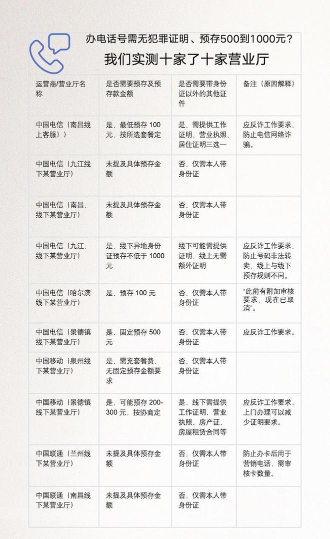 “我想在南昌办一张电话卡,但营业厅说需要无犯罪记录证明,这有道理吗?”近日,有消费者反映,办理线下电话卡时,电信营业网点要求其额外提供证明材料,有的还要求预存数千元的话费。记者对多个城市的移动、联通、电信的线下营业厅的办卡业务进行了实测,发现他们的评价标准差别很大——有的城市营业厅只要求你携带身份证办卡,有的则要求提供以下其中一项:“犯罪证明”、“就业证明”、“pah”,甚至要求预存500元至1000元的电话费押金,并核对房产证明或营业执照。为何办卡有如此多的要求?不少营业厅的工作人员解释道。这是为了响应反欺诈要求,但基于此的具体规定尚不清楚。工信部通信委委员、通信委委员刘兴良在文件中表示,运营商需要对姓名、个人处理、实人认证等进行验证,《规定》明确允许运营商在其他领域办卡时提出要求。如果经营者必要时提及附加条件,且没有当地法规依据,其合法性值得怀疑。记者对多家运营商的办卡进行了实际业务测试,发现该地区不少营业网点在其他地区办卡的门槛存在明显差异。江西多地“提高”江西多地办卡门槛。在《境外身份证办理新电话卡》的基础上,重新搬运工在江西、福建、甘肃、黑龙江等地的10个营业厅进行了实际手机测试。他们发现,不同地区的评估标准差异很大。其中,江西多地办卡门槛明显“提高”。江西景德镇中国移动线下营业厅的工作人员表示,线下办理外国人身份证,需要提供以下任一材料:就业证明、营业执照、房产证、房屋租赁合同等,并需缴纳500元押金。若材料不齐全,可联系区域经理前来申请。此时物质要求放宽,只需确认在当地居住或创业即可。该工作人员表示,此举是为了提高办卡门槛,防止电信网络诈骗,防止移动办公人员犯罪办卡后可在其他地区办理。这种要求并非景德镇独有。江西其他城市也可以办理其他地区的卡。中国联通和电信也执行相同的标准,并按照相关规定执行。景德镇另一家中国电信线下营业厅的工作人员表示,办理境外身份证,只需携带身份证到现场即可,不需要就业证明、无犯罪记录等其他材料。但无论选择哪种套餐,都需要预付500元押金。当地的中国联通和中国移动对于申请国外身份证也有类似的预存款要求。江西省九江市联通线下营业厅的工作人员询问了记者的身份证所在地,并澄清,由于防范电信诈骗,任何就业、营业证明均被盗取。申请外国身份证需要许可证或居住证明。如果您打算开店,提供营业执照即可,无需其他附加材料;同时需要预存话费,金额根据套餐而定,最低100元。证明材料和预存电话费是强制性要求。当记者表示“营业执照、就业证、居住证不予办理”时,工作人员回应“线下营业厅可能不办理”,并确认“线上app申请不需要额外提供证明材料,可以直接下单,与线下要求不同”。相比之下,福建、甘肃、黑龙江等地区的办卡门槛则相当宽松。福建泉州移动工作人员表示,申请和申请没有区别卡有本地和外国身份证。您只需携带身份证并按照套餐充值即可,无需再提供证明;甘肃兰州联通只需“口头确认不打营销电话并证明您名下卡数不超标”,无需预存款;黑龙江哈尔滨中国电信要求定期存款100元,只需要你的身份证。工作人员指出,“之前还有额外的审核要求,但现在已经取消了”。此外,我们发现,即使有本地户籍,在江西当地一些电信营业厅办理电话卡时,仍需要提供就业证明、安全审查证明、无犯罪记录证明、银行流水单等。有消费者在相关平台投诉称,他们在其他地方办卡之前也遇到过类似情况。男人y工作人员称这是严格的“反欺诈”审查,但该政策的依据尚不清楚。为什么申请卡的要求不同?多位营业厅工作人员将原因解释为“落实反舞弊工作”。记者进一步询问了该运营商在多个城市的客服情况。记者拨打了江西南昌市3家运营商的客服电话。中国电信客服明确表示,“为应对反诈骗要求,用户入网(办卡)需提供无犯罪记录证明、就业证明或银行对账单,具体以营业厅为准。”当记者询问具体依据是什么规定时,对方表示,“我没有看到详细的文件”。不过,南昌一家线下联通营业厅的工作人员表示,只需携带身份证即可直接申请新号码。 C江西南昌中国联通客服表示,尚未发现具体规定,将记录评论后再回复;中国移动江西南昌客服表示,外国人南昌办卡只需要身份证,不需要其他证明。记者注意到,运营商客服和线下营业厅的具体要求也可能不一致。例如,上述南昌电信客服在办卡时需要提供相关证明。不过,当记者随机拨打南昌市多家电信营业厅的电话时,工作人员表示,即使是外地人办卡,也只需要身份证,不需要其他材料。上述规定是否合理?针对多地要求的《无犯罪记录证明》,记者查阅了《关于完善和规范无犯罪记录证明签发的意见》经查,该证明仅适用于“升学、现役、就业”等合法情况,异地申请电话卡不在此列。另外,大部分客服人员或业务人员无法提供相关政策文件。当被问及“是否有反诈骗要求的具体文件”时,南昌电信客服表示,“我们还没有看到详细的文件。”景德镇移动客服虽然提到“这是工信部的规定”,但没有提供具体条款,消费者自理后也找不到相关规定。在“黑猫投诉”平台上,记者注意到,部分消费者也有类似经历。有网友在2024年11月向中国联通投诉,称“不符合规定”。