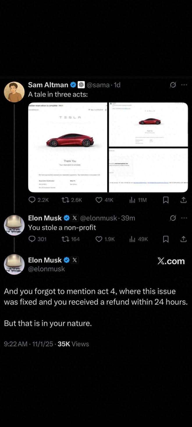 - 2025/11/05向特斯拉订购新车7年未拿到,Openai CEO奥